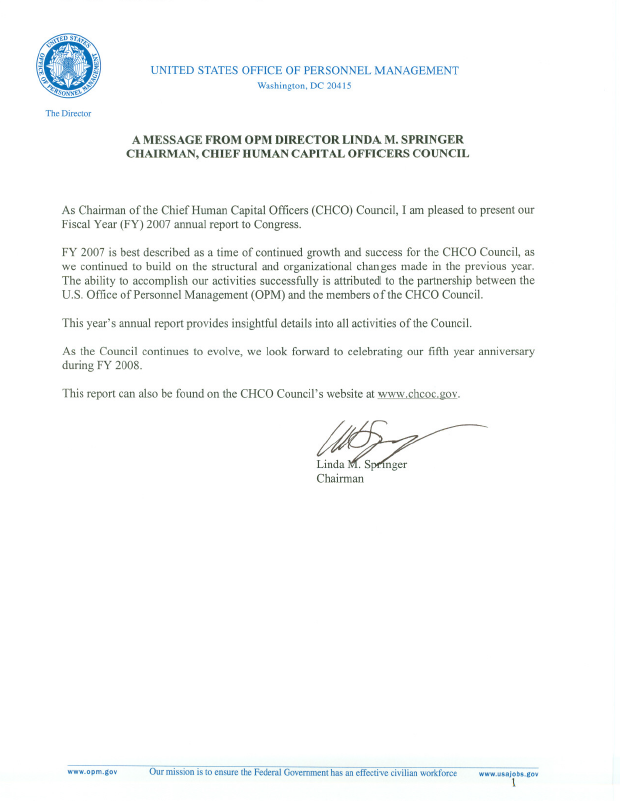 The Chief Human Capital Officers (CHCO) Council submits an Annual Report to Congress as required by the Homeland Security Act of 2002. These reports highlight the Council’s efforts to modernize federal human capital policies, strengthen the workforce, and advance initiatives that support agency missions. Each year’s report reflects progress, priorities, and collaboration across government to ensure a high-performing and skilled federal workforce.